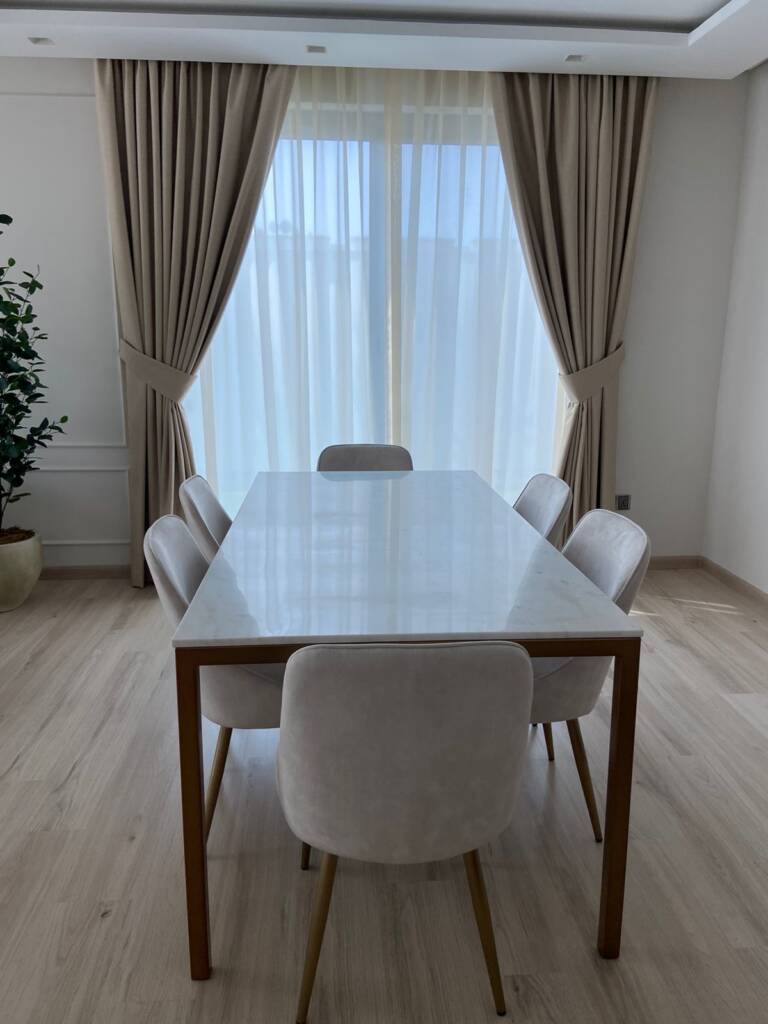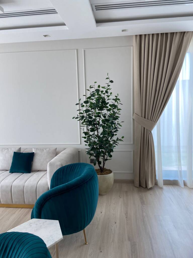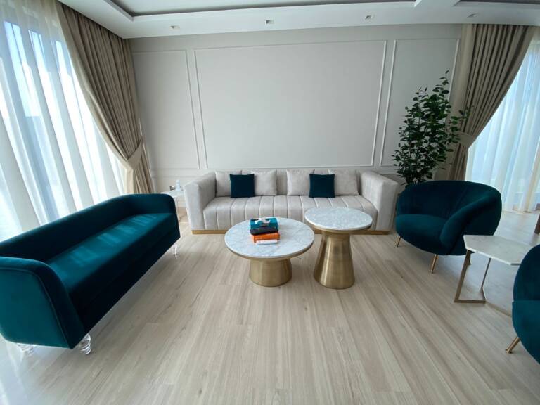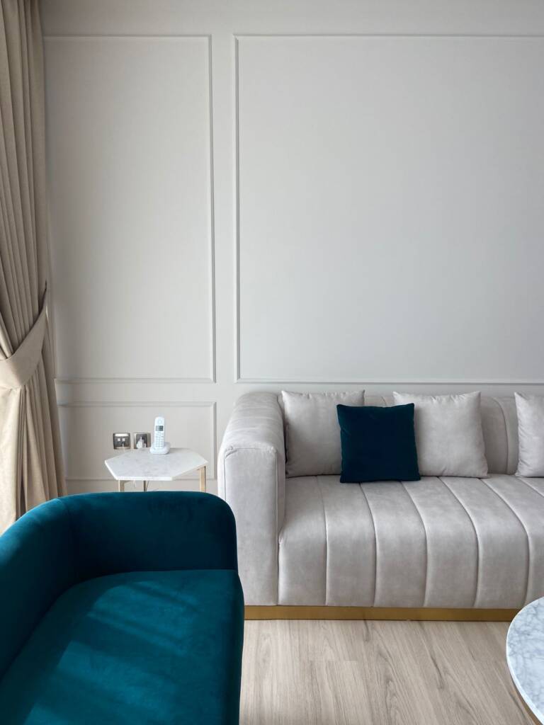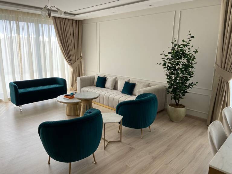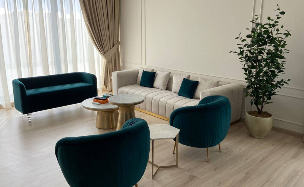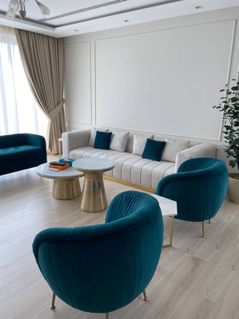 A blend of modern luxury and tranquil design. We combined soft neutrals with vibrant teal accents to create a serene yet sophisticated living space.