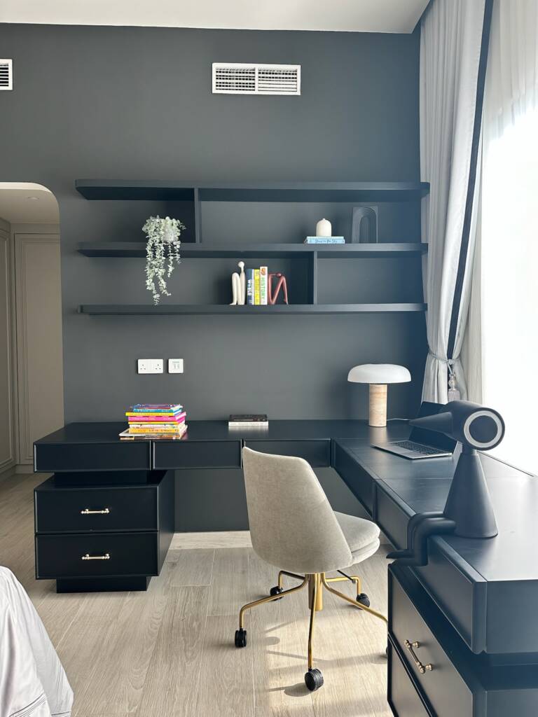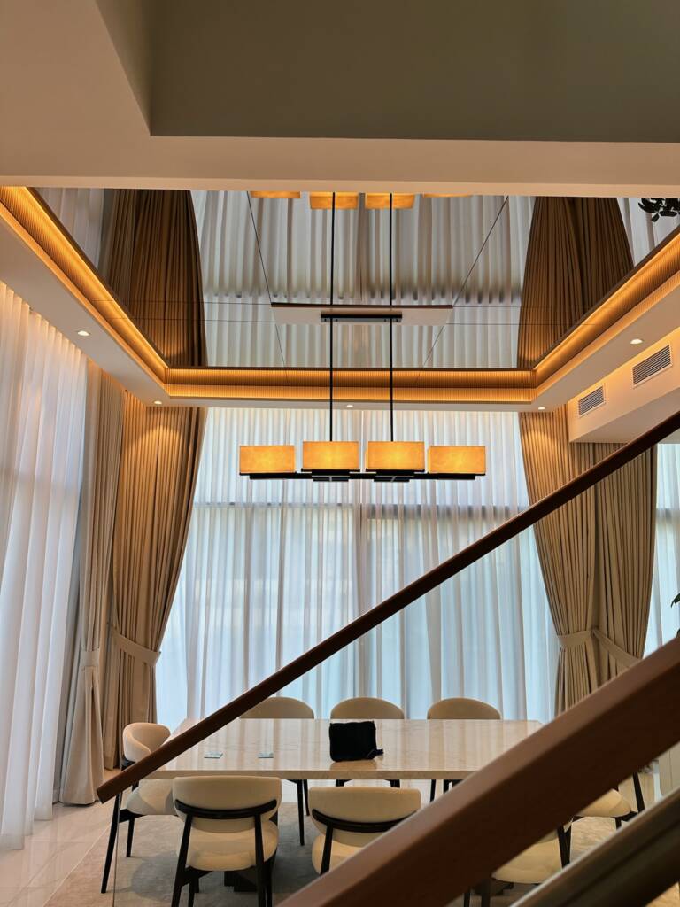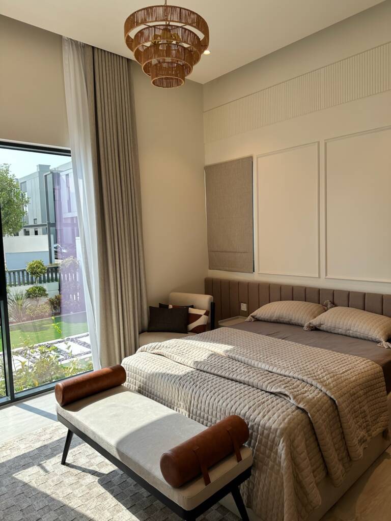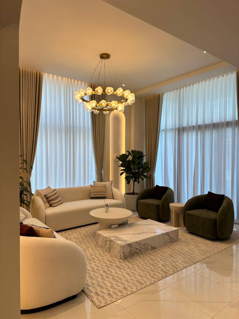Celestial Villa in Al Furjan is designed with a focus on modern luxury, blending clean, contemporary lines with rich, textured finishes. The villa features spacious, open-plan living areas that offer both functionality and comfort, while expansive windows allow natural light to flood the interiors. Every element, from the high-end materials to the custom finishes, is carefully curated to create an inviting atmosphere that exudes elegance. Whether it’s the plush seating areas or the beautifully designed ceilings, this villa offers an elevated living experience that combines style and substance.